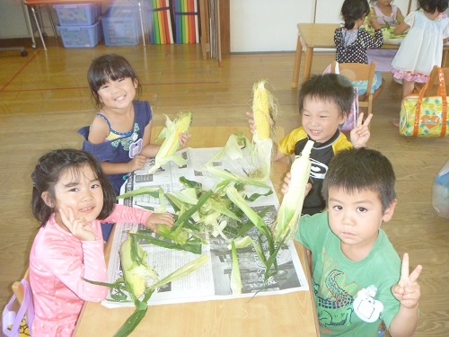 ふじ組(4歳児)さん、しろ組(5歳児)さんが、とうもろこしの皮むきを体験しました。