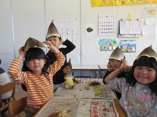 白組さん(年長)が、たけのこの皮むきを体験しました。 大きなたけのこに、みんなの目は真ん丸でした。 「いい匂いがするね~」「皮がふわふわしてるね~」と大発見をしていた様子でした。