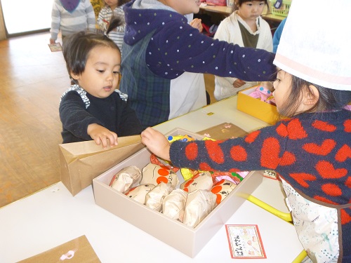 乳児クラスは「せいうんベーカリー」アンパンマンぱんやドーナツが売られていました。黄組さんがレジ担当です。