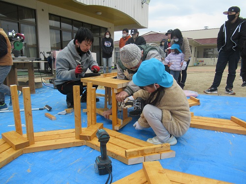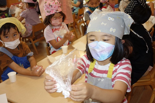 クッキングの為に、保育室からぷれいるーむまで机や椅子を皆で運びました。机を運ぶ際に、「2人だと重いよ。4人で持とうや」「角を持った方が良いんじゃない?」「赤ちゃんがお昼寝の時は静かに通ろうや」等、子ども達が話し合いながら、準備や片付けを行っていました。頼もしい限りです。