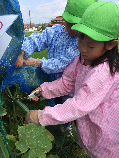子ども達は、暑い中、水やりをしたり草取りをして、大切に野菜を育ててきました。そして、ナスやキュウリ、ミニトマトなど・・美味しい野菜ができています。収穫した野菜は給食でいただいています。取りたての「トマト」は甘かったですよ。