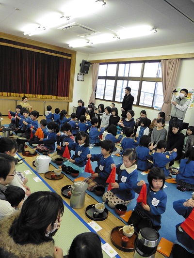 給食は「ちらし寿司」「ちくわの天ぷら」「添え野菜」「お吸い物」でした。お吸い物の野菜(大根・人参)は、しろ組(年長)さんが型抜きをしました。米とぎはふじ(年中)組さんが担当しました。