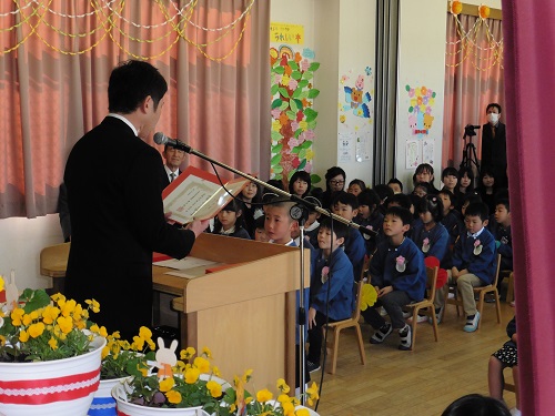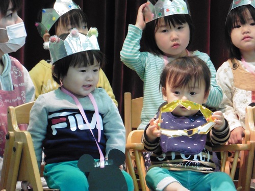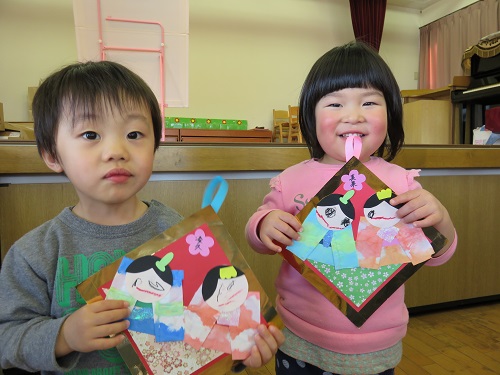 子ども達が作った「ひな人形」をクラスごとに披露したり、「おひなさま」のパネルシアターを見たりしました。