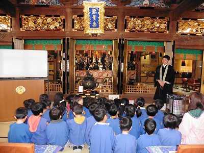 年長組の子どもたちは、本堂でお参りをしました。