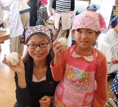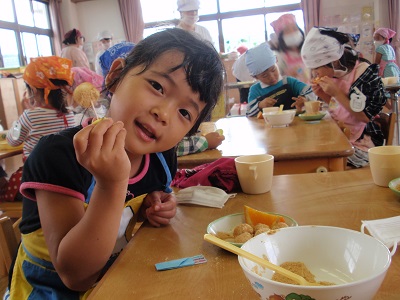 豚汁とおむすびを作りました。 ごぼう、さつまいも、大根、人参、こんにゃく、 豆腐などの材料をみんなで分担して切りました。 硬めのさつまいもや人参はちょっと大変でした。 園庭に設置した大鍋で煮込み、美味しい豚汁が出来上がりました。 おむすびはワカメ入りです。大きなおむすび、丸いおむすび、いろいろなおむすびが出来上がりました。