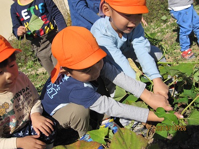 10月26日秋晴れのもと、芋ほりをしました。 5月に植えたさつまいもの苗は、ぐんぐん成長していました。 どんなお芋が出てくるかな~ みんな、はりきって掘りました。