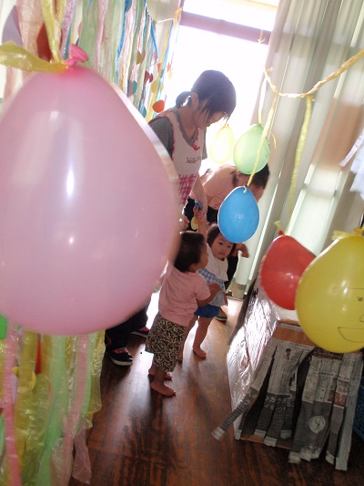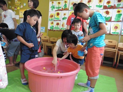 ヨーヨーつり・きんぎょすくい・わなげ・ボーリング・くじでお面をもらったり、質問に答えてお菓子をもらったり、制作コーナーではうちわを作りました。会の最後には先生たちの出し物や子どもたちの踊り「にんにん忍たま音頭」もありました。2部のしろ組さんはバンブー太鼓を披露しました。