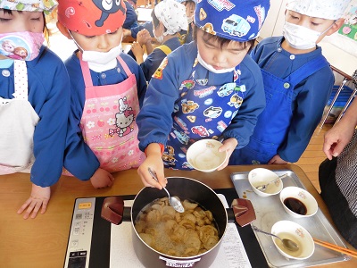 しろ組(年長)さんが「お茶のお点前」を家族の方に披露しました。お茶の後は、保育園職員からメッセージと歌のプレゼント、保護者の皆さんが準備してくださったダンス対決や歌、思い出の写真のスライドショーもありました。最後は子どもたちが合奏、歌を披露しました。楽しいお茶会になりました。