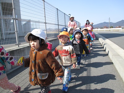 あか組さんは保育園の周辺をお散歩しました。 お天気にも恵まれ、ポカポカ春の日差しの中で、楽しいお散歩になりました。