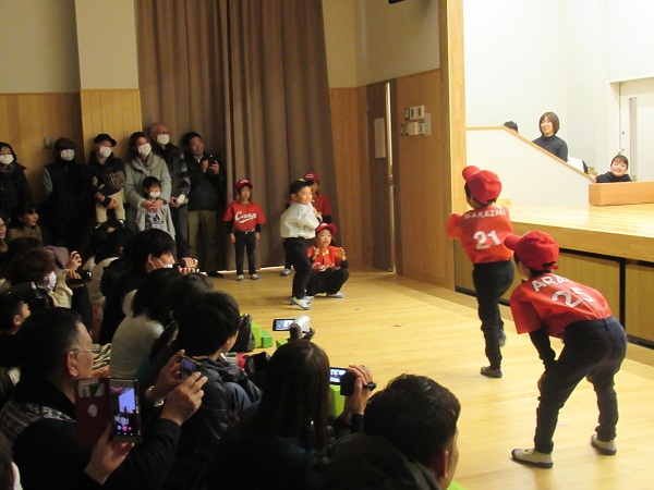 12月7日(土)発表会を行いました。 今年度は子どもたちの発表の前に「子どもたちの日頃の様子・育ち」を担任から報告しました。 この写真はしろ組(5歳児)が「カープの軌跡」という劇をしているところです。この場面はカープが優勝した瞬間を再現しているところです。