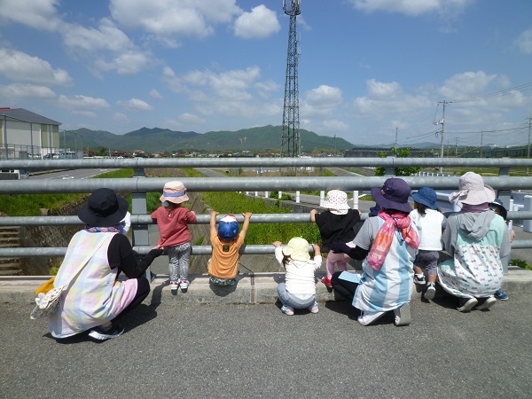 あか1組さんのおさんぽ 川を観ています。何かいるのかな?