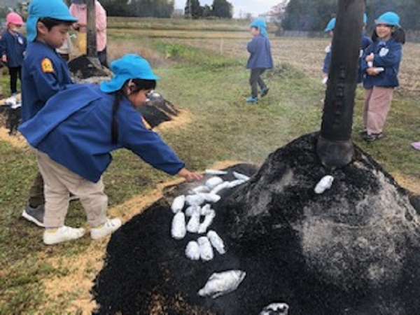 「やきいも」をしました。 10月にみんなで収穫した「さつまいも」です。 今日は新聞紙とアルミを巻いて、アツアツの「すくも」の中に入れました。 朝、見たときは「すくも」が山盛りだったのに、午後、見たときは黒くなっていて、量も減っていることに気づいた年長の男の子がいました。「なんで?」「なんで?量が減ったの?」と熱心に質問していました。