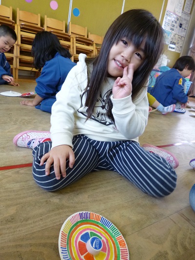 紙皿・ペットボトルのキャップ・アルミハクでこまを作りました。 たくさん回るように・・・ ともだちのまわし方を観察したり、早くしてみたり、力を入れてみたり、考えながらチェレンジ中です。