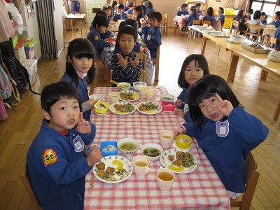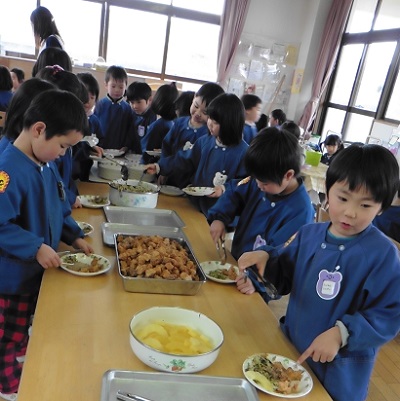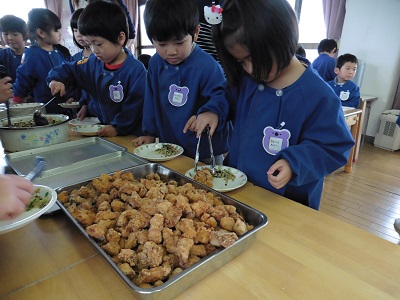 しろ組さん(年長)・ふじ組さん(年中)が、バイキング給食を行いました。2クラス混合で11グループに分けて給食をいただきました。いつもとちょっと違うお部屋で、いつもとちょっと違うメンバーで、いつもとちょっと違うバイキング給食。園長先生も一緒に楽しい給食の時間でした。