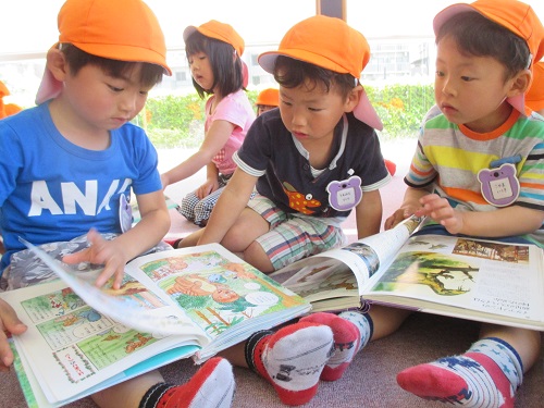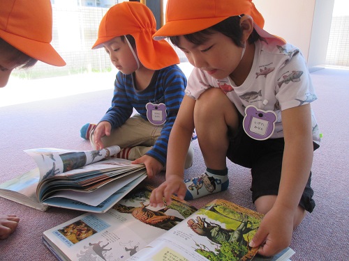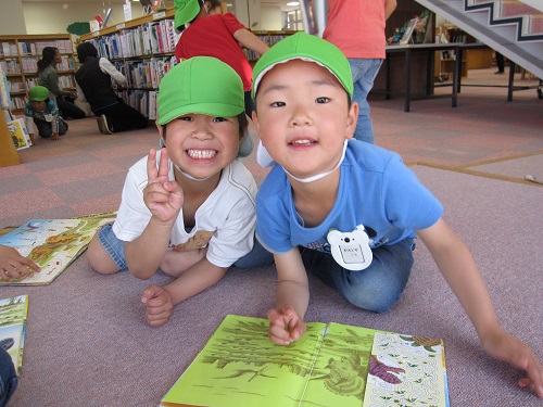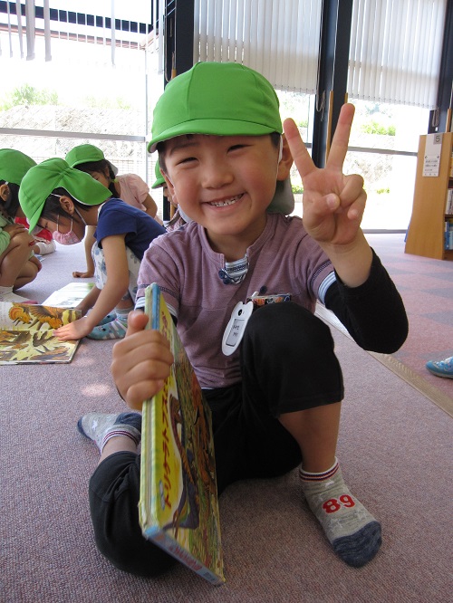 5月17日はしろ組さん。18日はふじ組さんが図書館へ行きました。到着すると職員の方が「図書館は、どんなところ?」「図書館でのマナー」について、お話をしてくださいました。大型絵本も読んでくださいました。