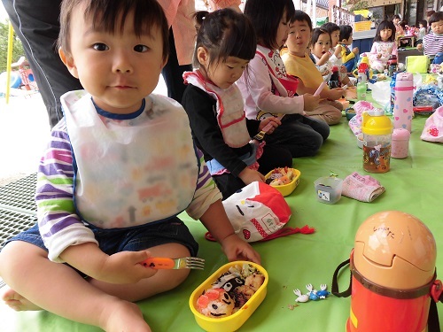 乳児クラスは保育園のテラスでお弁当を食べました。