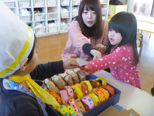乳児クラスは「せいうんベーカリー」アンパンマンぱんやドーナツが売られていました。黄組さんがレジ担当です。
