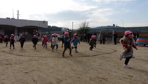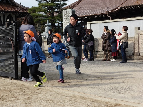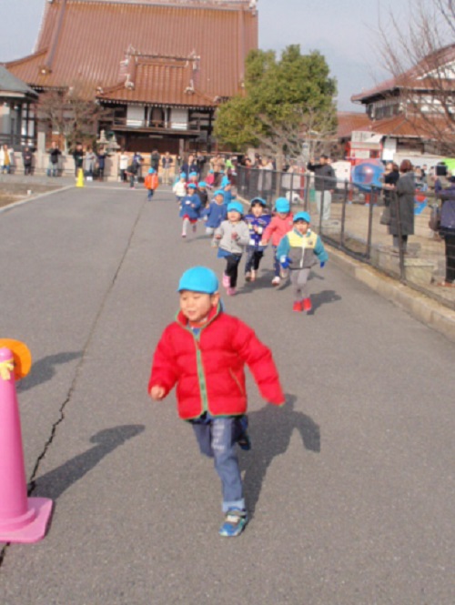 12月中旬から園庭を走り、1月からは園庭を出てコースの練習もしました。練習をするうちに「速く走りたい」「1番になりたい」という気持ちが芽生えてきた子も多くいました。年中組、年長組では、コース練習の時の1位がいつも変動していました。
