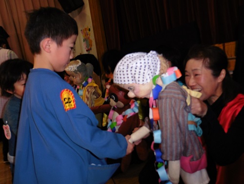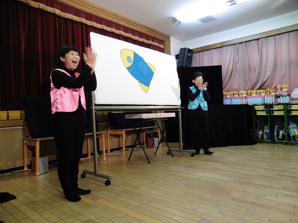 人形劇やパネルシアター、ブラックファンタジーなど子どもたちはくぎ付けでした。大きな声で笑ったり、歌ったり、時には驚いたり・・・とても喜んで観ました。おうちの方が迎えに来ると「今日ね~人形劇みたんよ。」と話している子がたくさんいました。
