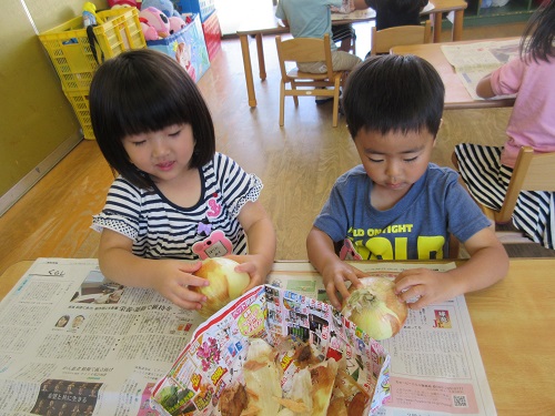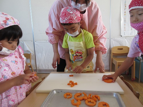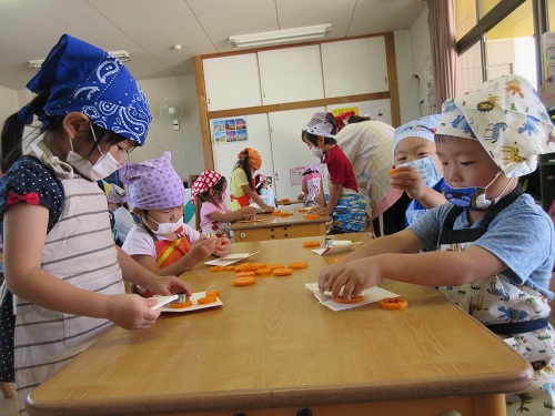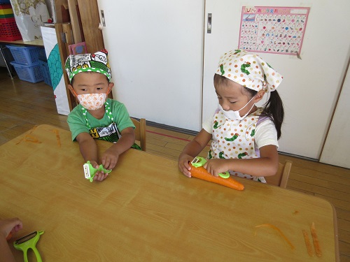 15日(木)は、翌日のカレーパーティーに向けて、幼児組(3歳児~5歳児)は野菜の準備を行いました。みんなお手伝いが上手です。