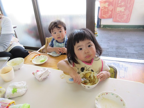 16日(金)は、みんなが楽しみにしていたカレーパーティーでした。天気が良かったので、外で大鍋を準備してカレーを作りました。カレー作りには、しろ組(年長)さんがお手伝いをしてくれました。野菜を炒めたり、各クラスの配膳もしてくれましたよ。