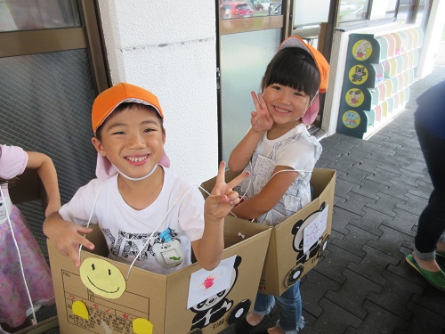 しろ組(5歳児)さんは、段ボールと廃材を使って乗り物を作りました。