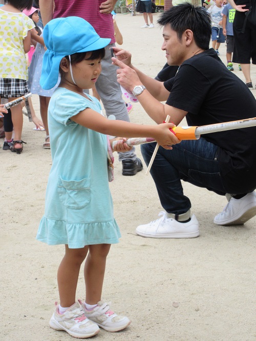 ふじ組(4歳児)さんは、ロケットを作り、外で飛ばして遊びました。