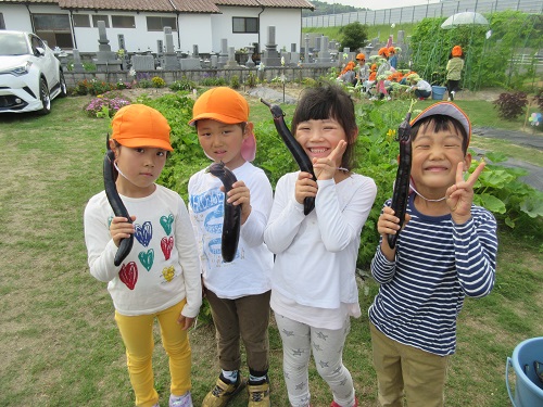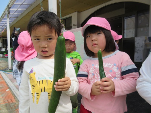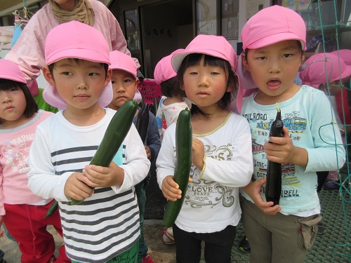 5月に植えた夏野菜の苗が立派に成長し、夏野菜が大収穫です。もも組(年少)さんが収穫に行きました。