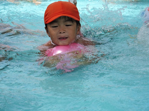 プール遊びでは、ボールを使って蹴伸びの練習をしました。