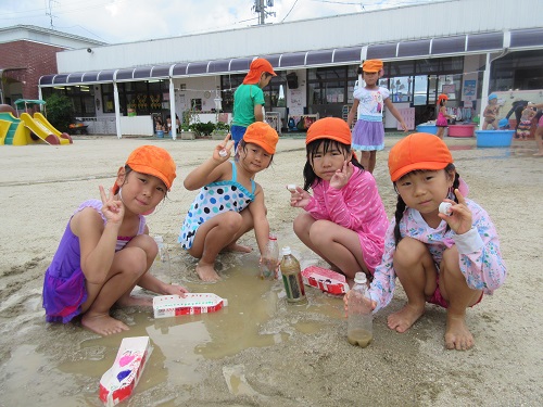 園庭に流れた水を利用して、泥遊びも楽しみました。