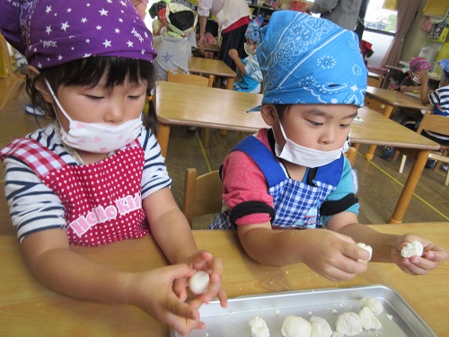き組(2歳児)、もも組(3歳児)、ふじ組(4歳児)、しろ組(5歳児)は、お団子作りを体験しました。