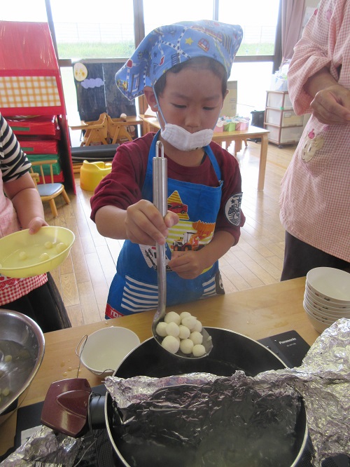しろ組(5歳児)は、団子を丸めて茹でるとこまで体験しました。