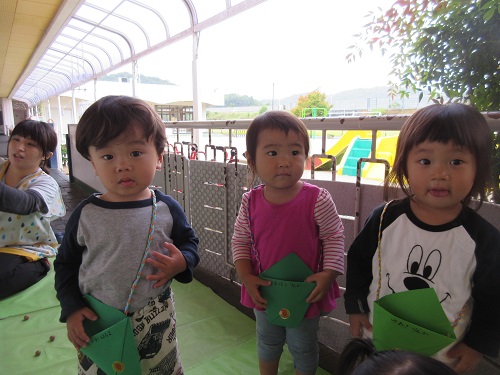 あか0(0歳児)、あか1組(1歳児) どんぐり拾いを楽しみました。