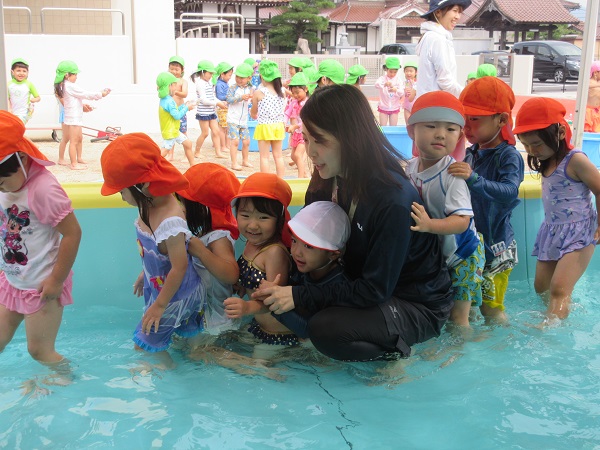 大きいプールは、初めてのもも組さん ちょっとドキドキ