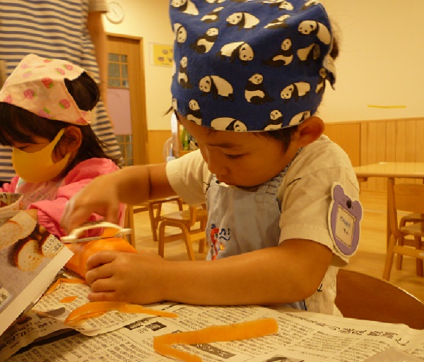 ふじ組さんが、ピーラーを使って皮むきをしました。