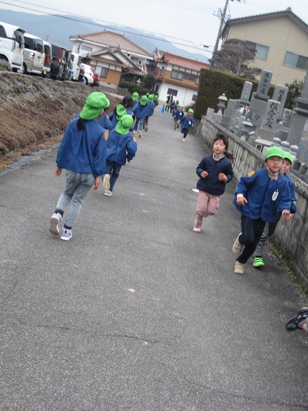 年長組はお寺の裏まで走ります。体力があります。