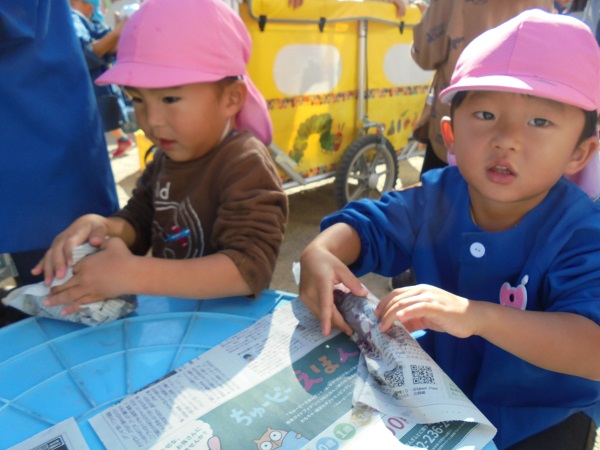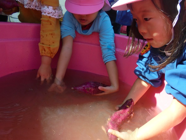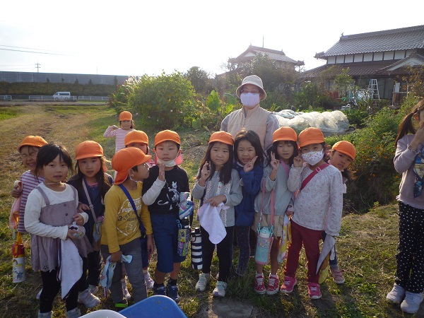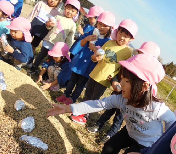 10月に掘ったお芋で「やきいもパーティー」を行いました。掘ったお芋は甘くなるように、外で天日干しをしました。毎年、地域の方が田んぼですくも等の準備をしてくださいます。朝、早い時間から火をつけて準備をします。子ども達は10時頃にお芋をすくもの中に入れ、おやつの時間に取りに来ます。