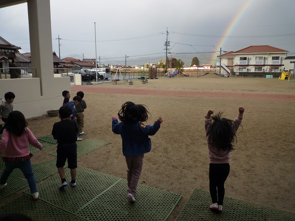 「虹はね 雨が降ったあとにでるんよ」と友達に説明中です。
