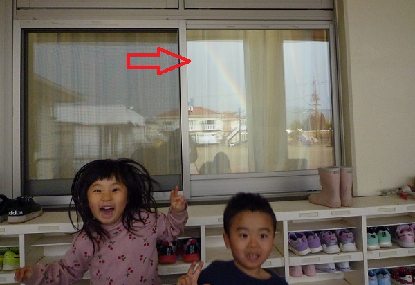 窓にもにじがうつっとる~ 写真撮って~
