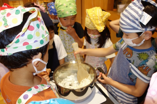 クッキングの為に、保育室からぷれいるーむまで机や椅子を皆で運びました。机を運ぶ際に、「2人だと重いよ。4人で持とうや」「角を持った方が良いんじゃない?」「赤ちゃんがお昼寝の時は静かに通ろうや」等、子ども達が話し合いながら、準備や片付けを行っていました。頼もしい限りです。