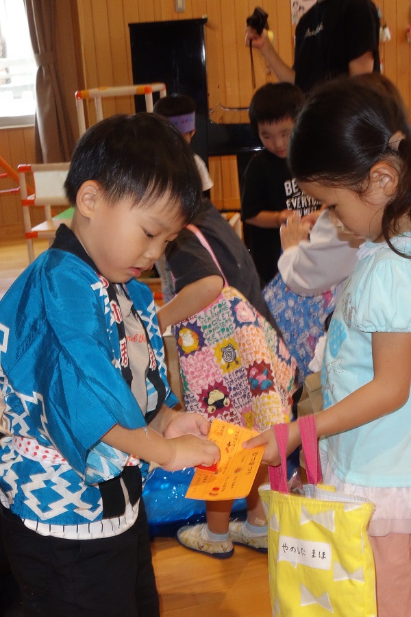 「射的」「輪投げ」「金魚すくい」「ボールすくい」「うちわ」「お菓子すくい」等楽しいことが、いっぱいの夏祭りになりました。昨日は会場作り、子ども達が製作した景品を並べたり、飾りつけをしていました。
