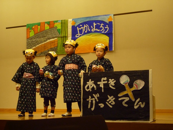 ここは「あずきあらい」の「小豆楽器店」皆で小豆の楽器を持ち、歌を歌いました。