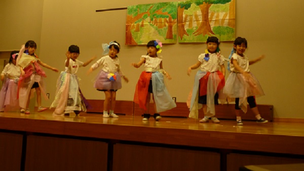 ふじ組(年中)は鬼退治のお話。プリキュアやウルトラマン、プリンセス等、好きなキャラクターになり登場です。衣装は手作り 振り付けも子ども達がしました。
