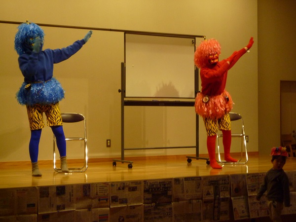 ダンスで登場♪ コミカルな動きに子ども達は大喜びでした。踊った曲は「赤鬼と青鬼のタンゴ」です。
