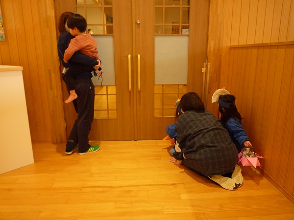 「鬼は怖い~」とお部屋の外から見ている子ども達もいます。