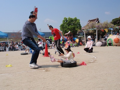 タイヤ引きレースです。カープ坊やのお面をつけてます。