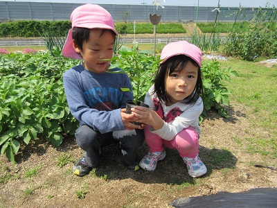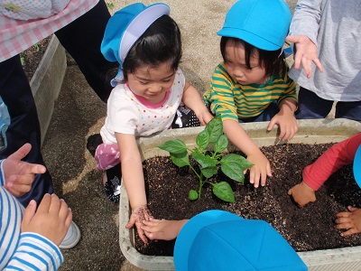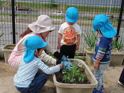 しろ組さん、ふじ組さん、もも組さんが夏野菜の苗を植えました。