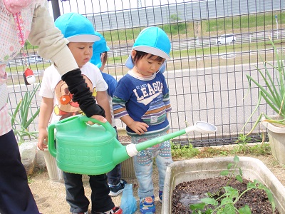 黄組さんは園庭のプランターにトマトとピーマンを植えました。