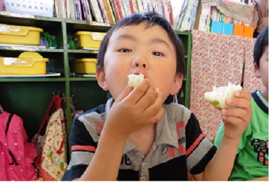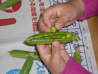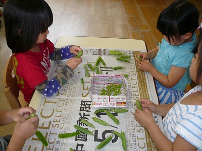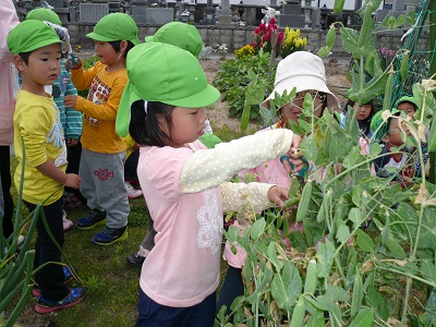 ふじ組(年中)さんが、グリンピースの収穫をしました。
