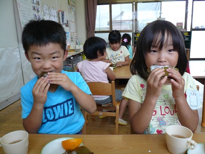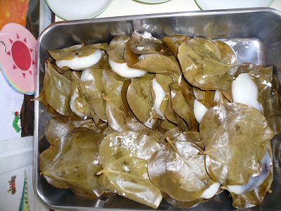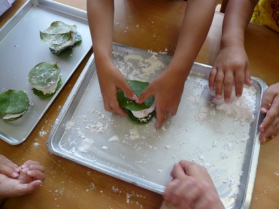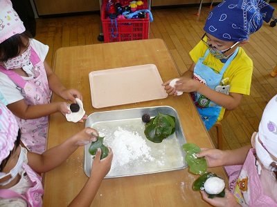 しろ組(年長)さんとふじ組(年中)さんが、しば餅を作りました。団子の皮にあんこを入れます。しばの葉で包んで、給食室で蒸してもらいました。出来立てのしば餅は、とても美味しかったです。